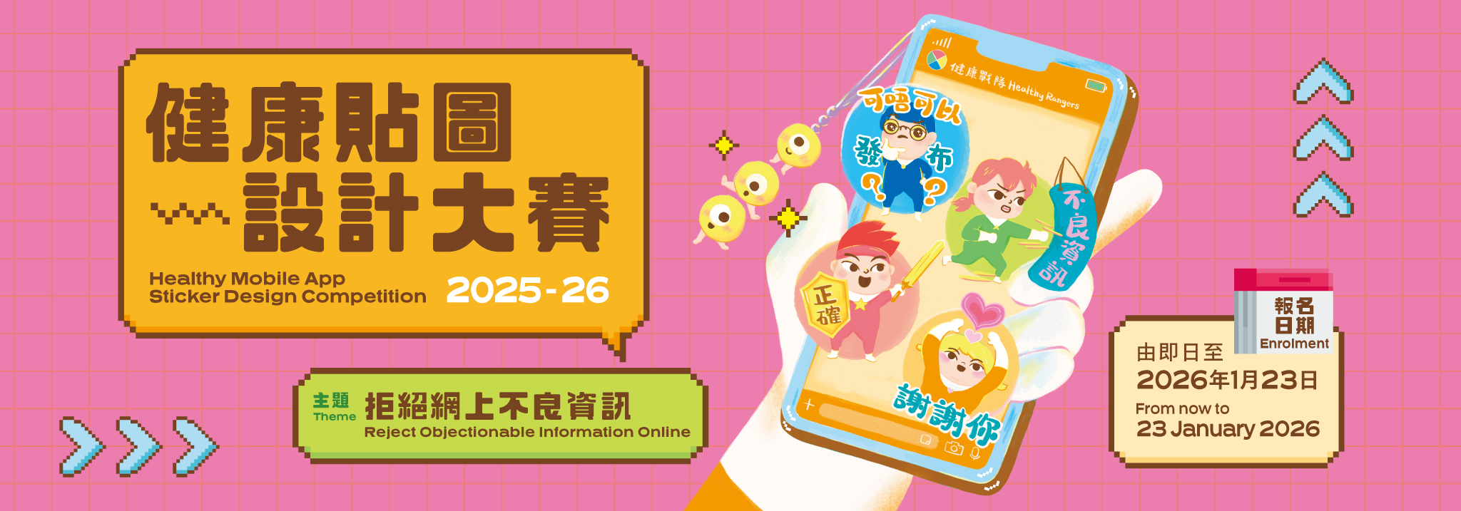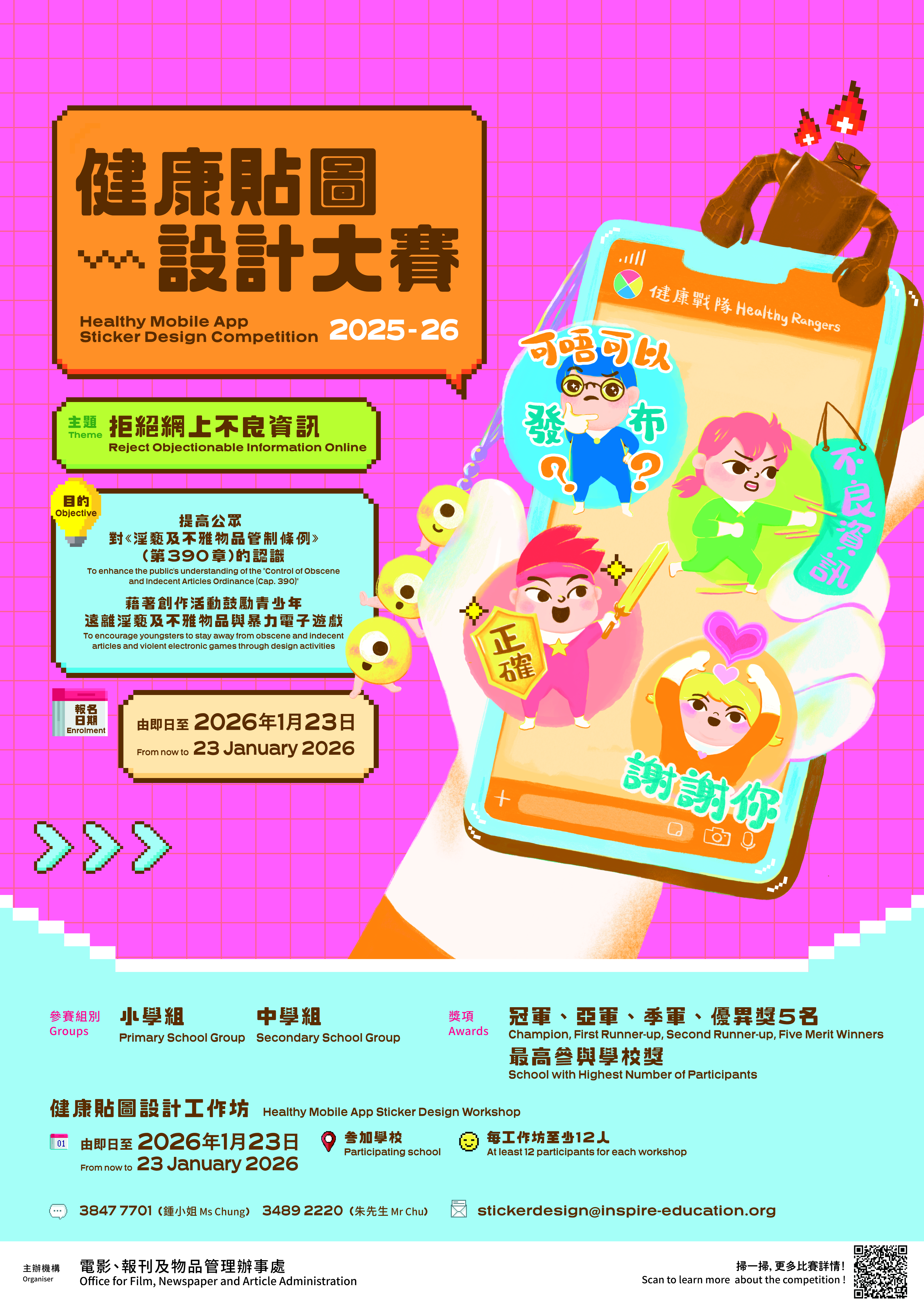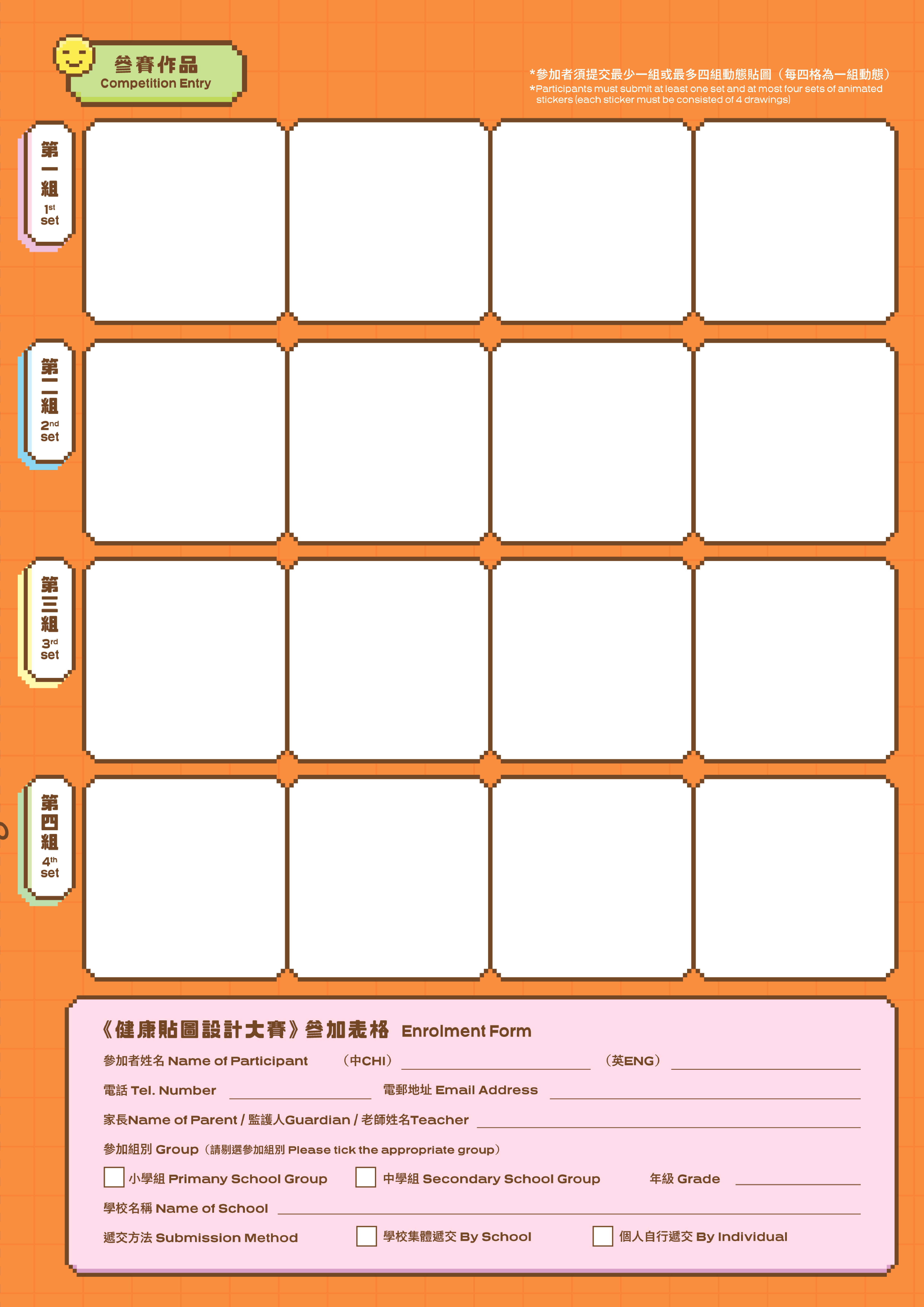Participants shall submit enrolment forms and entries by email (email address: stickerdesign@inspire-education.org);or post to P.O. Box 88154 Sham Shui Po Post Office (please specify "Healthy Mobile App Sticker Design Competition" on the envelope).