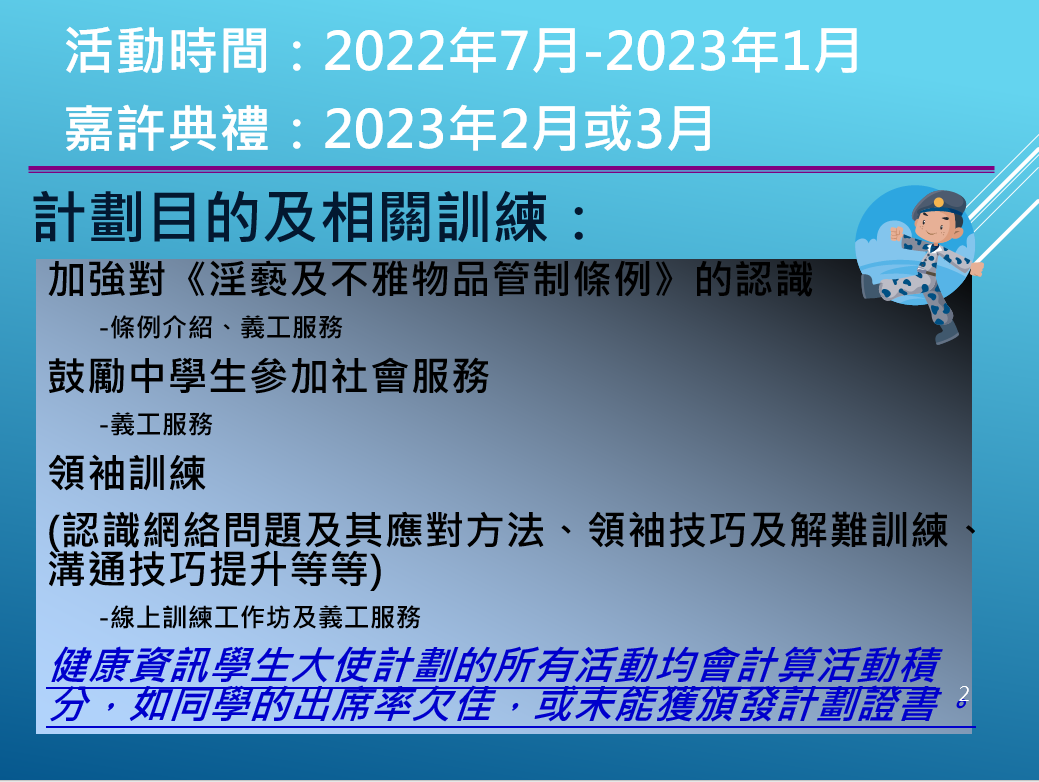 Upon completion of the training programme, the Student Ambassadors will participate in a range of publicity and public education activities that promote the healthy use of the Internet, including teaching parents basic computer skills and introducing their fellow students to the relevant provisions of the COIAO.