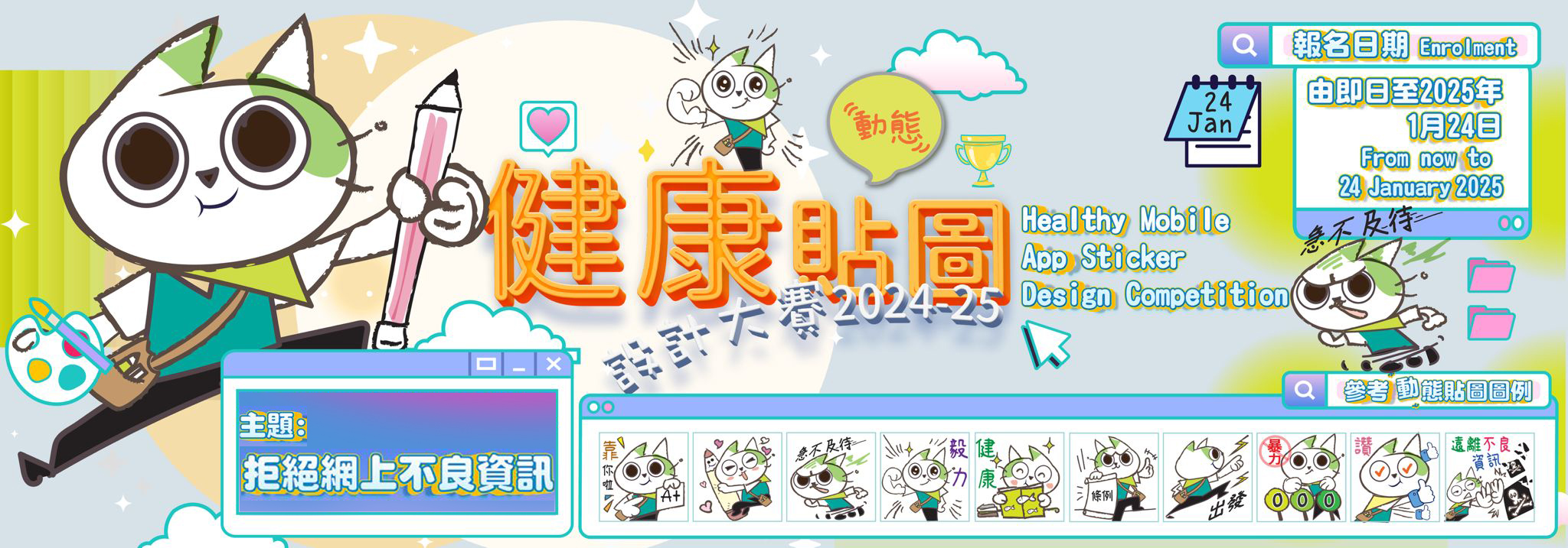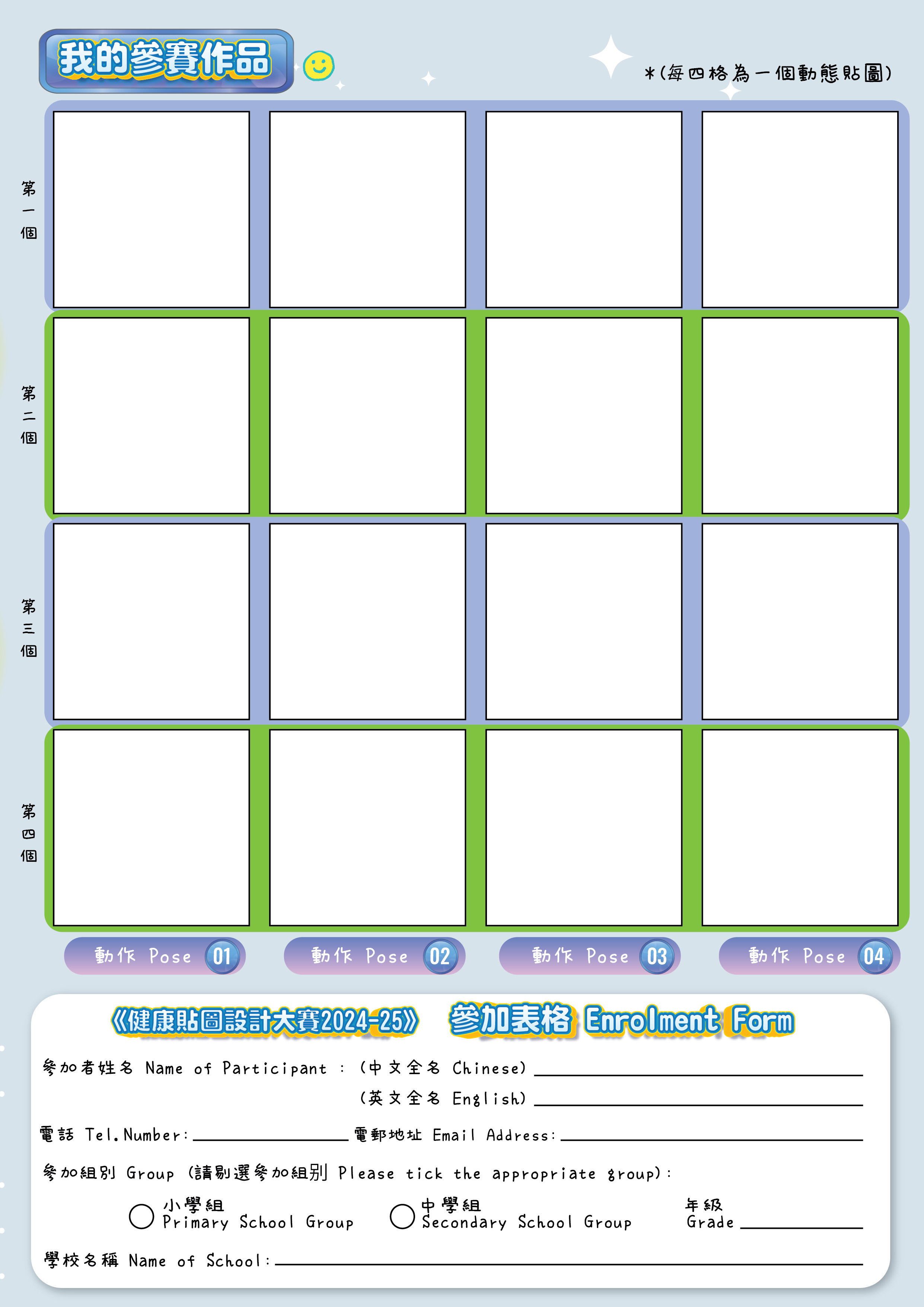 - If the person is to submit in digital format, the files must have a resolution of 300 dpi or above. For animated stickers, the files submitted must be in GIF format, with the single animation loop not longer than 3 seconds. Participants may also submit 4 graphics in JPEG format for each sticker. The size of each sticker must be 512 pixel x 512 pixel. PDF format of the provided A4 worksheet is also accepted. The A4 worksheet can be downloaded here. The organiser reserves the right to not accept any entries which do not comply with the prescribed specifications.